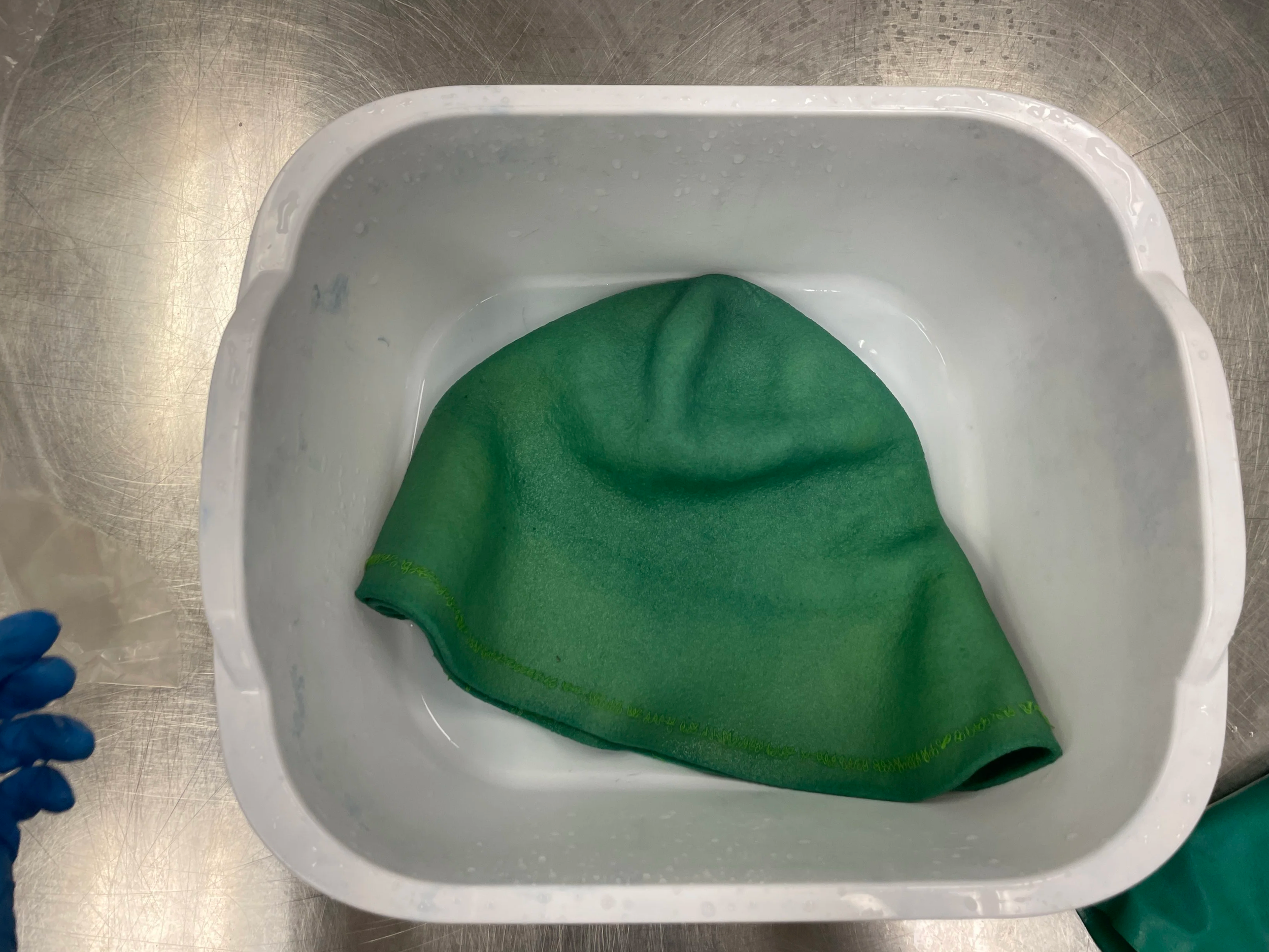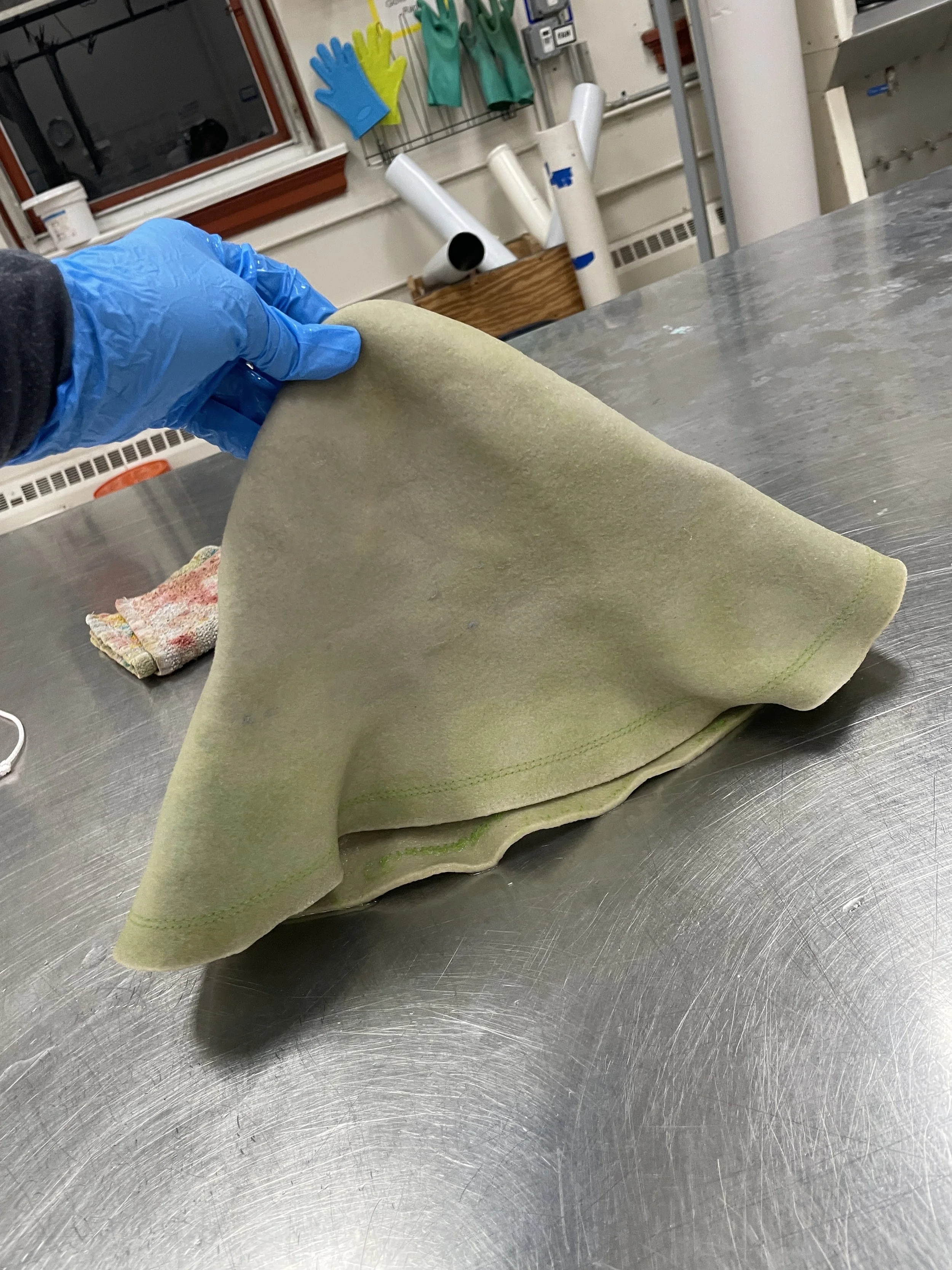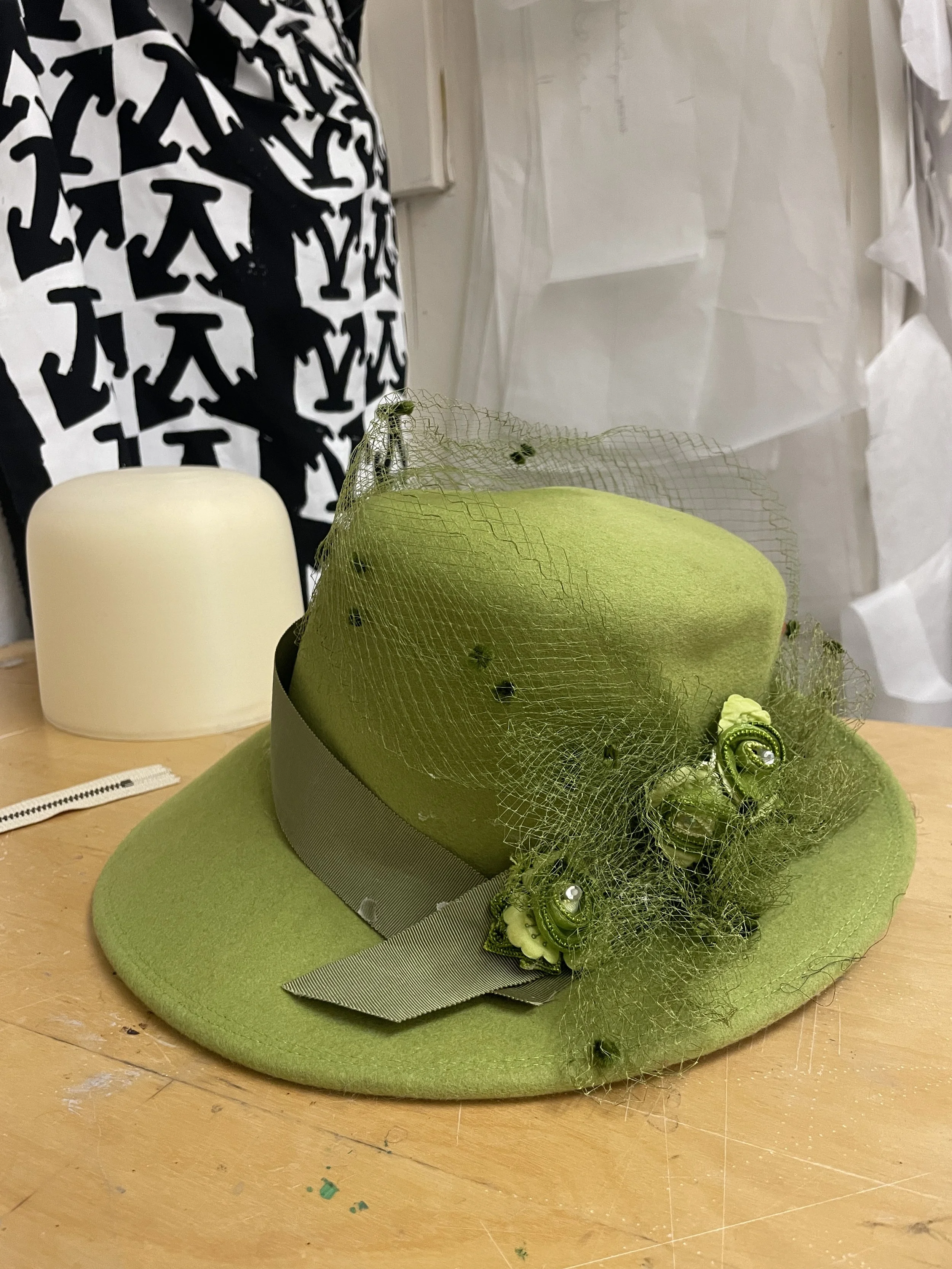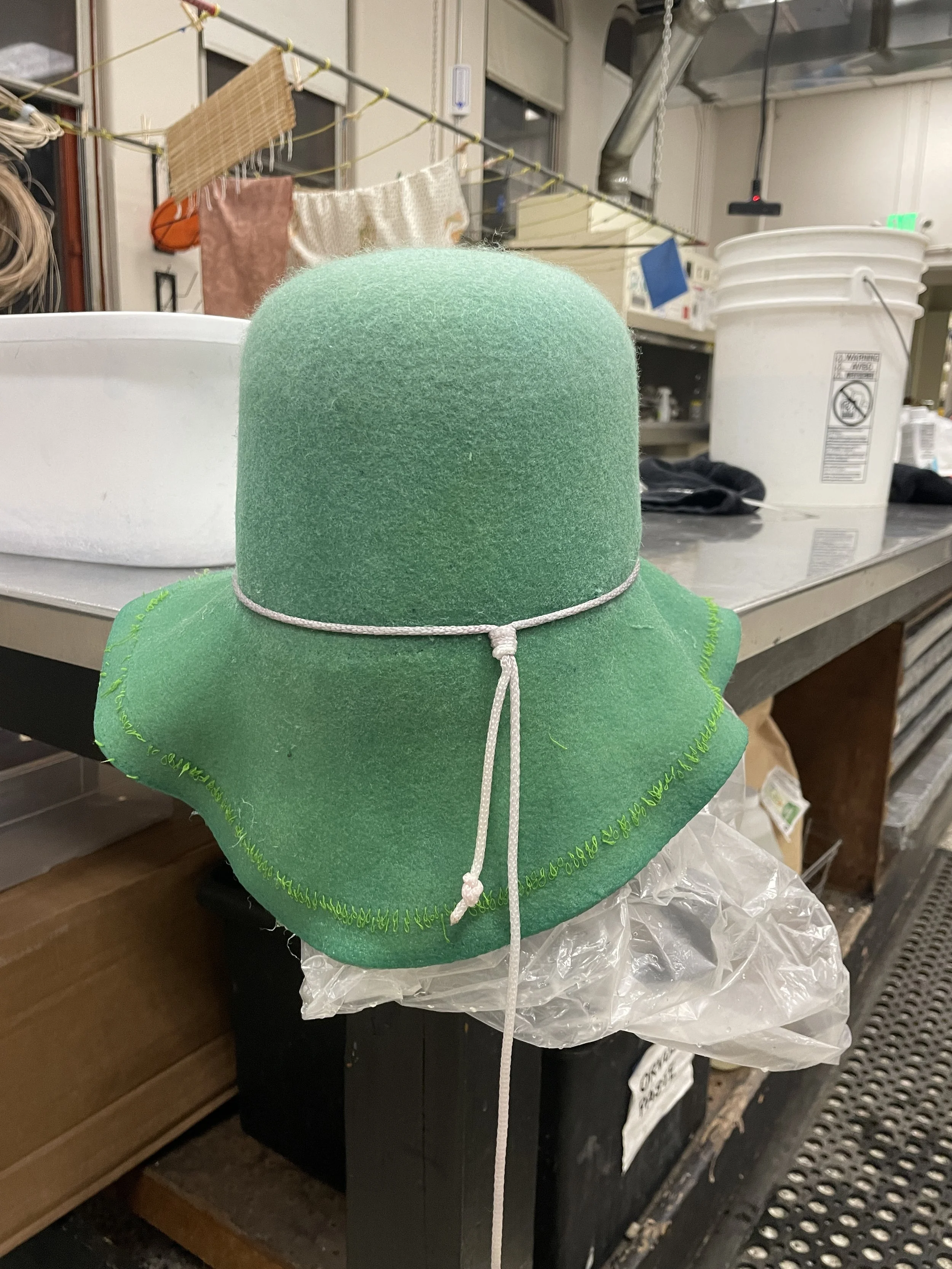 Steps for reclaiming a thrifted wool hat: color removal, dyeing, blocking, reshaping.