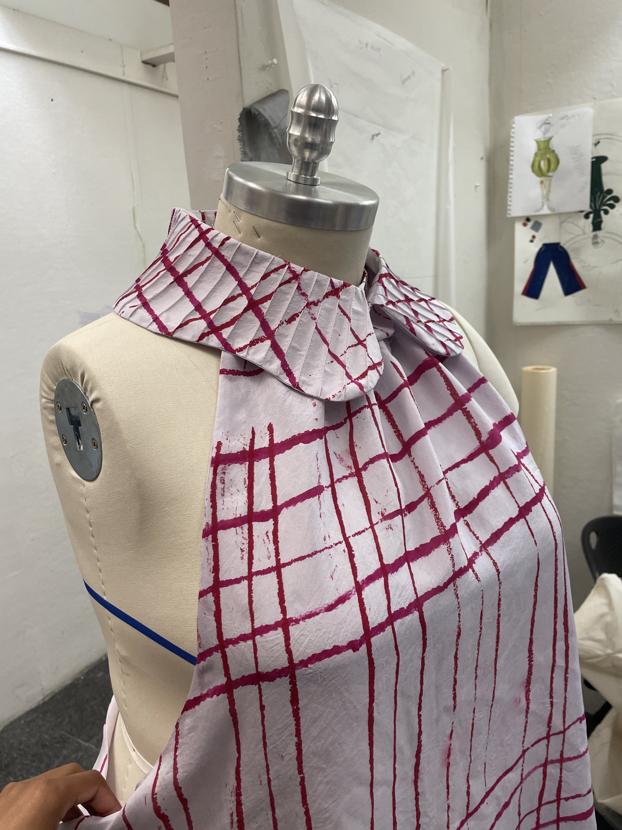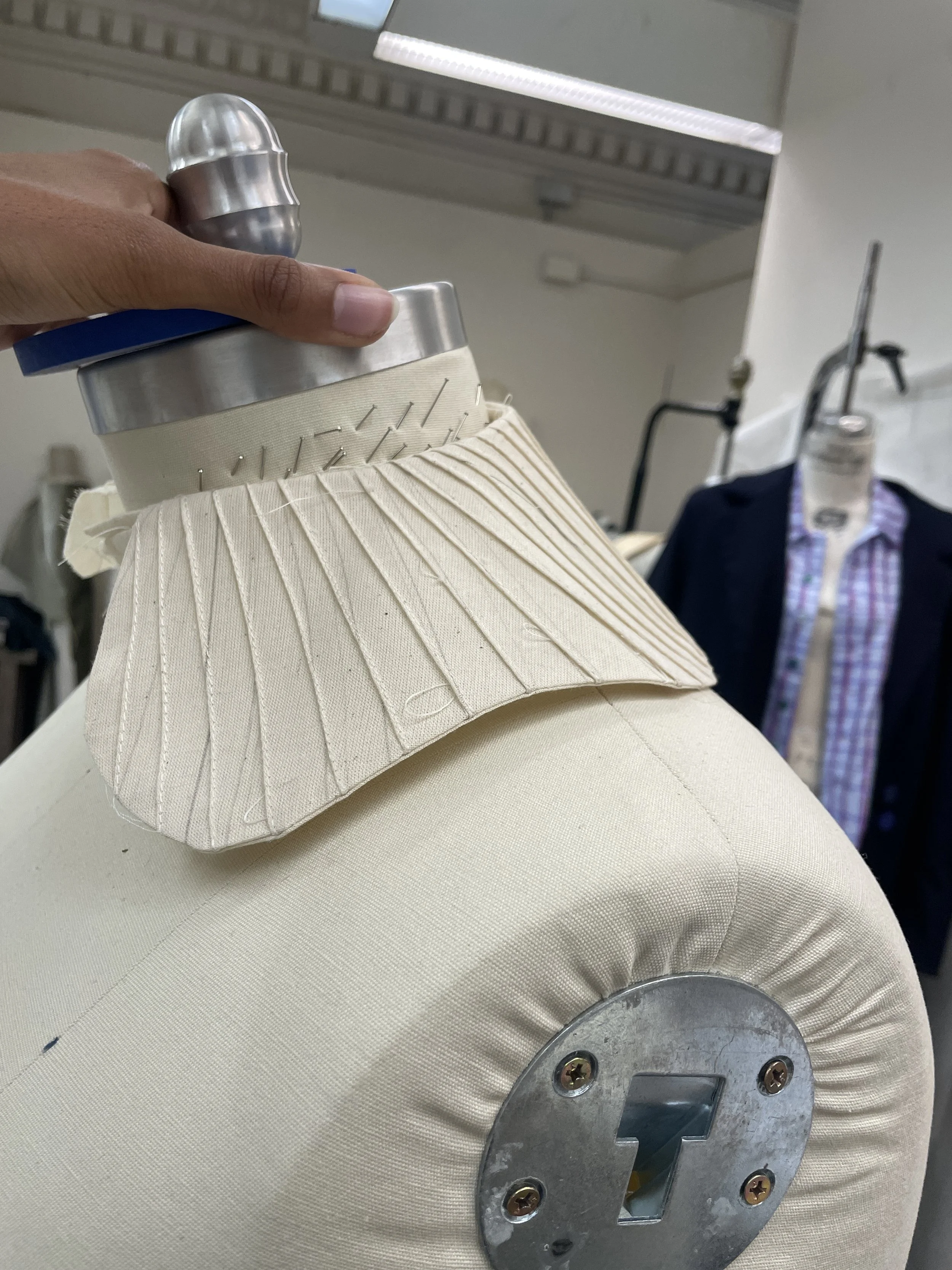In-progress tailored overcoat and hand printed collared shirt. 2025